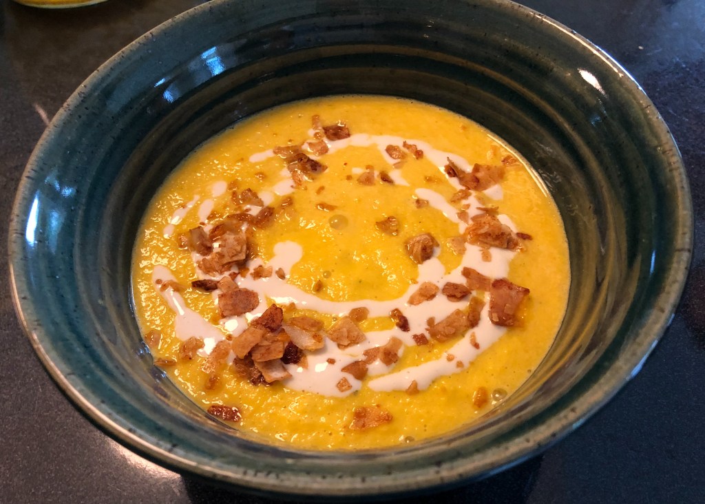 While your soup is chilling, prepare vegan versions of Nick’s toppings – coconut bacon and a basic cashew cream sauce.