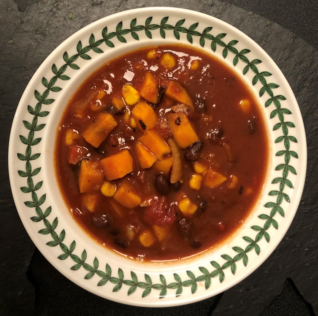 Pour the olive oil into a large soup pot. Over medium heat, add onions and corn and saute for about 5 minutes or until they’re browned a little. Add sweet potatoes and saute for another 5 minutes. Add chili powder, cumin, salt, cacao (this is my secret ingredient), and roasted red peppers. Stir until the spices are evenly distributed. Add the tomatoes, then fill the tomato can with water and add to the pot along with a tablespoon of bullion and beans. Simmer for about 45 minutes or until the sweet potatoes are soft. Dish it up and squeeze some lime over each bowl. This is great with some dairy-free yogurt and/or guacamole.